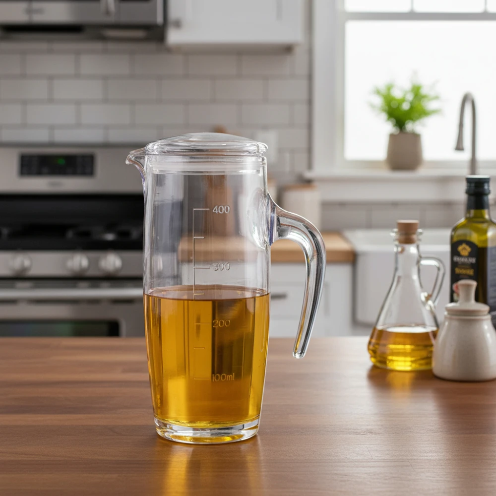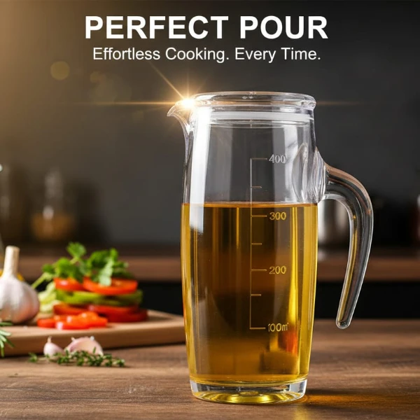 This  oil dispenser is designed for easy and mess-free pouring. Made from high-quality transparent glass, it features clear measurement markings and a comfortable handle for better grip.