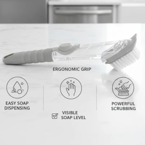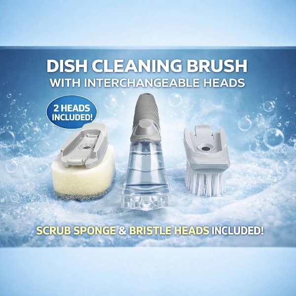 Multi-purpose cleaning brush with interchangeable sponge and bristle heads, featuring an ergonomic non-slip handle for efficient and comfortable everyday cleaning.