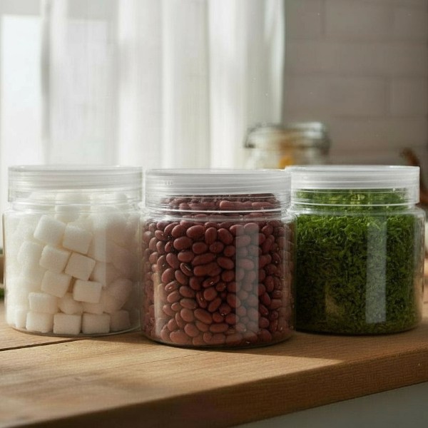 Clear airtight storage containers for organizing kitchen groceries like pulses, spices, snacks and more.