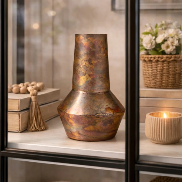 This Iron Planter is a striking blend of raw craftsmanship and artistic finish, designed to elevate both indoor and outdoor décor. Made from durable iron, the planter features a unique multitone patina with rich hues of bronze, copper, rust, and subtle golden undertones, giving each piece a one-of-a-kind, artisanal character.