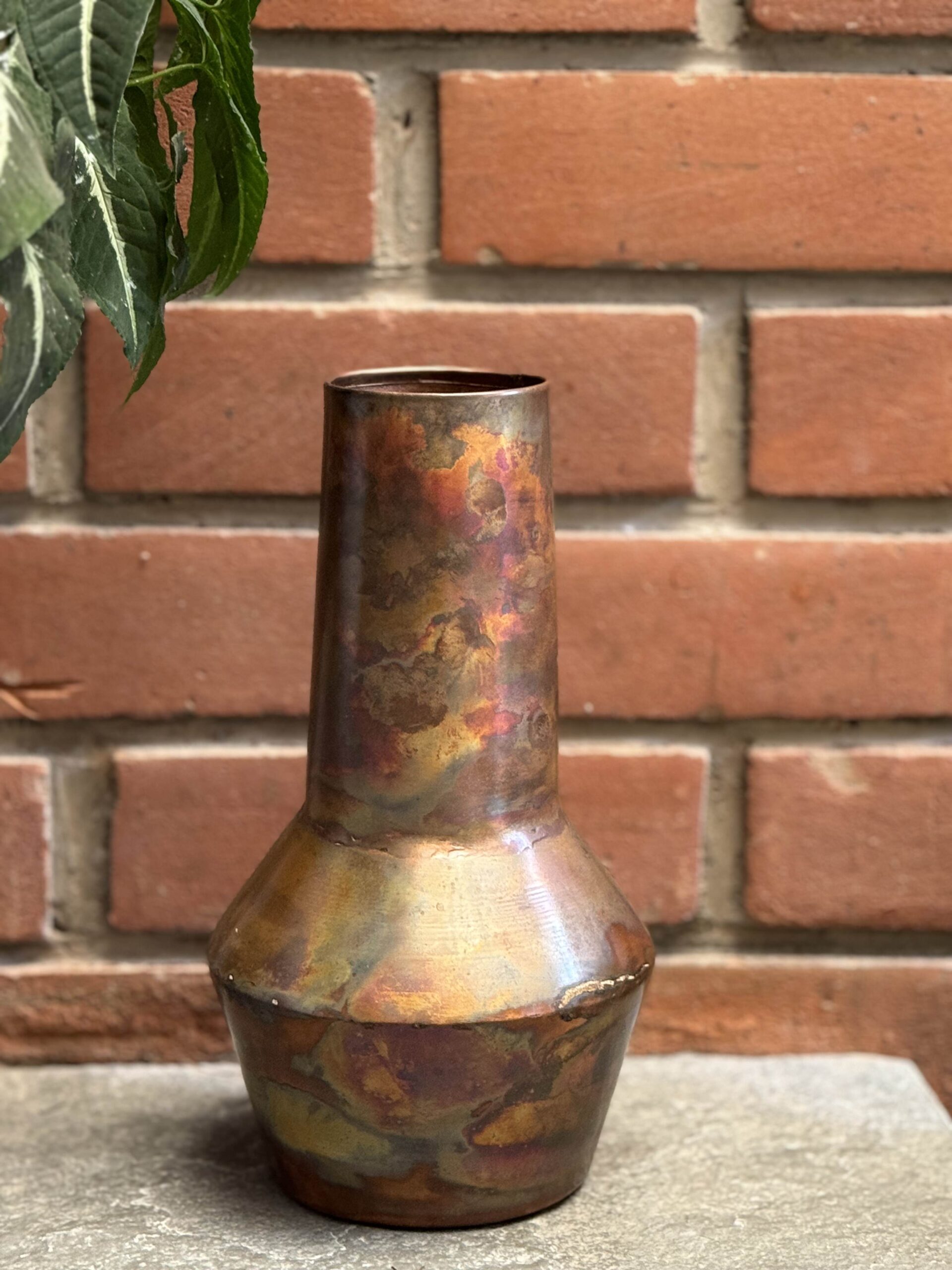 The planter’s elegant tapered silhouette widens gently at the base, providing visual balance and stability while highlighting the natural textures of the metal. The organically layered patina finish creates depth and warmth, making it an eye-catching accent whether placed in living rooms, balconies, patios, garden corners, or entryways.