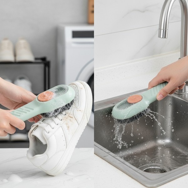 Multipurpose cleaning brush with built-in soap dispenser, ideal for cleaning shoes, dishes, sinks, and kitchen surfaces. Features durable bristles and a comfortable non-slip handle for effortless scrubbing.