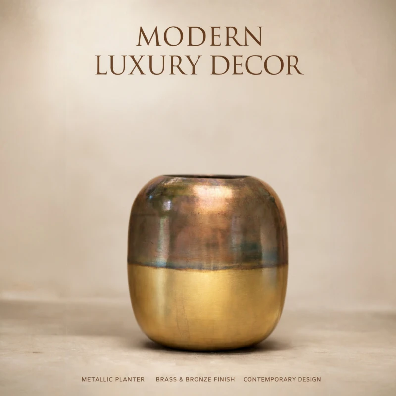Elevate your space with this modern  planter, featuring a striking two-tone finish in warm brass and rich bronze hues. Its smooth, rounded silhouette and subtly textured surface create a refined statement that blends seamlessly with contemporary, modern, and luxury interiors.