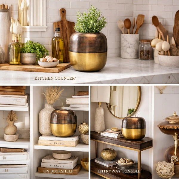Designed to complement any setting—from kitchen counters and bookshelves to entryway consoles and living spaces—this planter adds depth, warmth, and understated elegance. Whether styled with greenery or displayed on its own, it brings a polished, designer touch to your home décor.