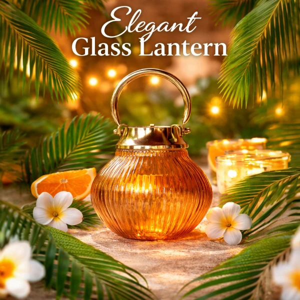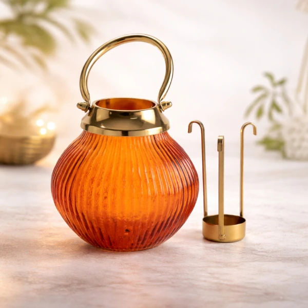 Add a warm, elegant glow to your space with this beautifully crafted amber glass lantern. Featuring a ribbed glass body and a refined gold-tone metal lid with a ring handle, this piece blends vintage charm with modern sophistication.