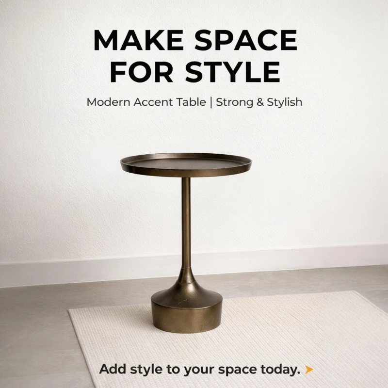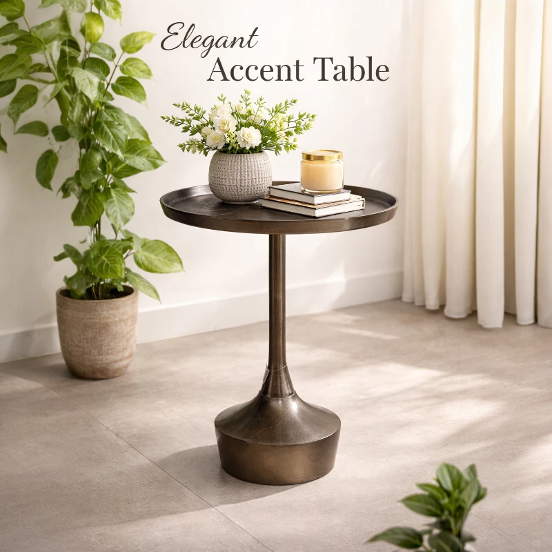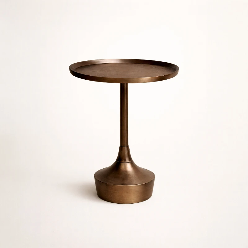 Crafted from durable metal with a rich antique bronze finish, the table showcases subtle texture variations that add depth and character. The raised-edge tabletop provides both visual definition and practical security, keeping items neatly in place. Its sturdy, weighted base ensures excellent stability while maintaining a clean, minimalist silhouette.