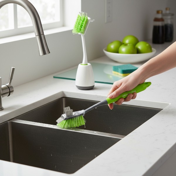 Durable multipurpose cleaning brush with a long ergonomic handle and dual-action bristles. Ideal for scrubbing sinks, tiles, and tough stains with ease.